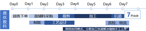 鹿优的中央裁剪及中央后道系统-关键品质工段。服装生产企业的前道裁剪单元及后道工序的设备投资强度最高,同时裁剪及后道往往因为产能不足而出现“前后道产能闲置”,一般缝制工厂通过投资低成本但低效的机械裁床和“后道”委托外厂加工的方式来组织生产,在品质及效率上可能存在较大风险。鹿优数科通过平台整合且分层分类缝制加??资源,投资前道智能电脑裁床及自研后道专机设备,将裁剪和后整打造成为平台共享产能,有效控制品质,?幅度提升效率,降低成本。