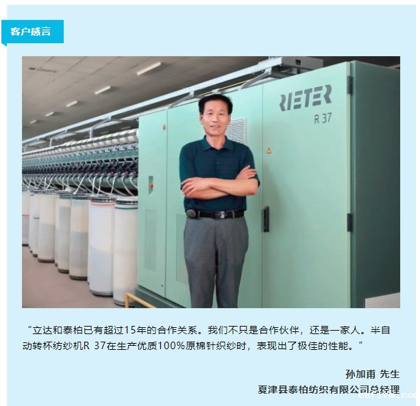 夏津县泰柏纺织有限公司位于山东省夏津县。该公司自2005年成立以来,一直与立达保持合作。泰柏最近购入两台半自动转杯纺纱机R 37,以扩充纱厂的现有设备阵容(两台BT 923、两台R 923和一台R 36)。目前,该公司共有2 500头产能。泰柏致力于生产优质纯棉针织纱,主要纱支为10英支、16英支、21英支和32英支,产品主要用于生产T恤衫和卫衣。该公司的纱线月产量达500吨。泰柏计划在未来几年将产能扩大到5 000头,需要继续投资数台优质的半自动转杯纺纱机。