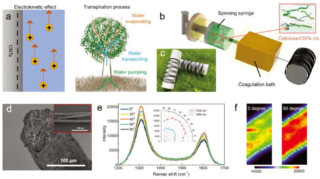受植物蒸腾作用的启发,研究人员采用了在一根亲水纤维素/碳纳米管纤维内获得稳定连续供水的概念,实现基于电动效应的连续发电。这种纤维是用LiOH/尿素/H2O混合的绿色溶剂通过连续湿法纺丝法制备的。它的溶解-凝固-再生系统是环保的,所涉及的加工程序已被证明能够实现可扩展和连续生产。