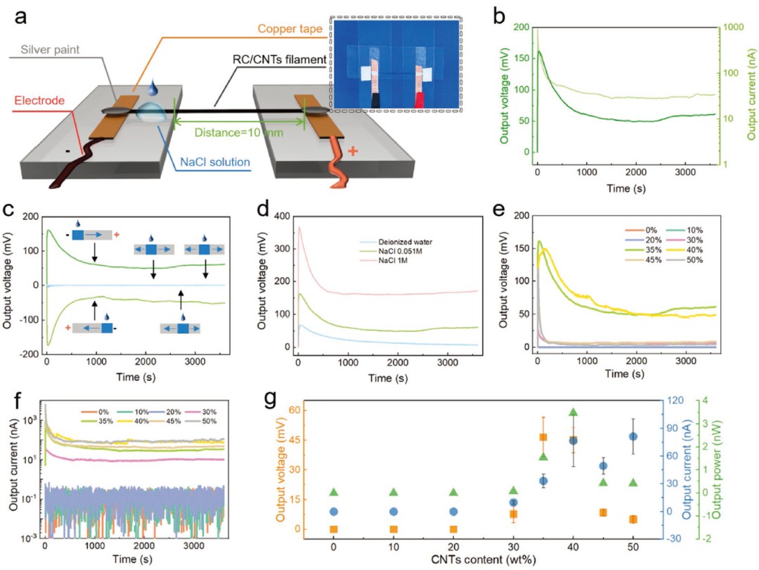 研究人员设计了一种自制的自供电装置,当NaCl溶液(0.2mL)滴在设备一侧时,将纤维浸湿,迅速产生电流。单根纤维的直流电压为55.8mV,电流为31.1nA,说明RC/CNT复合纤维可以自发发电。