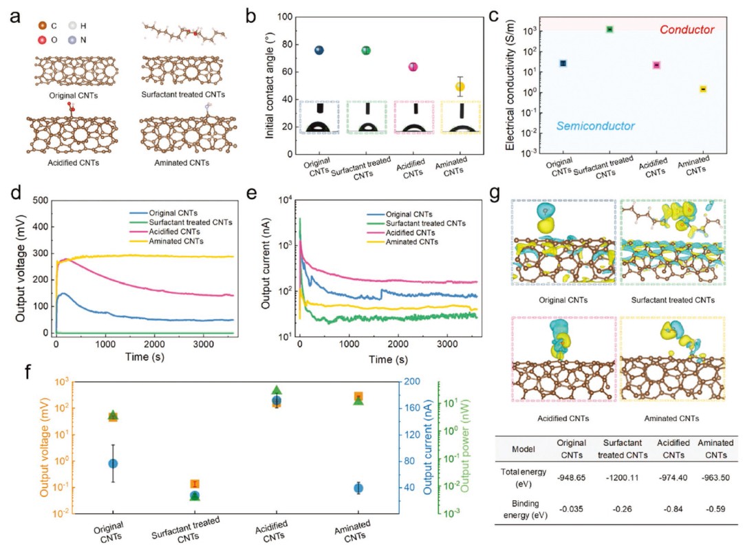 为了提高表面电荷密度,研究人员提出了三种不同的表面改性方法来优化RC/CNT纤维的发电性能。通过各种数据表明,足够的接触面积和CNTs与水分子的强相互作用,以及良好的输水能力共同影响输出电压。最终,RC/酸化CNT纤维的输出功率在四种不同的RC复合纤维中是最大的(27.6nW)。