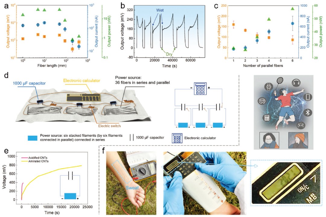 纤维尺寸对发电量的影响是显著的,研究人员在将其应用于可穿戴设备之前进行了研究。考虑到发电效率,选择暴露在空气中的长度为10mm(即总长度为20mm)的纤维进行研究。此外,经湿法纺丝制备的纤维在重复润湿和蒸发过程时,输出电压有周期性的上升/下降,表明其输出性能稳定,重复性好。更重要的是,纤维的输出性能可以通过轻松地连接更多纤维并联而成比例地提高,为多种应用提供了卓越的发电能力。