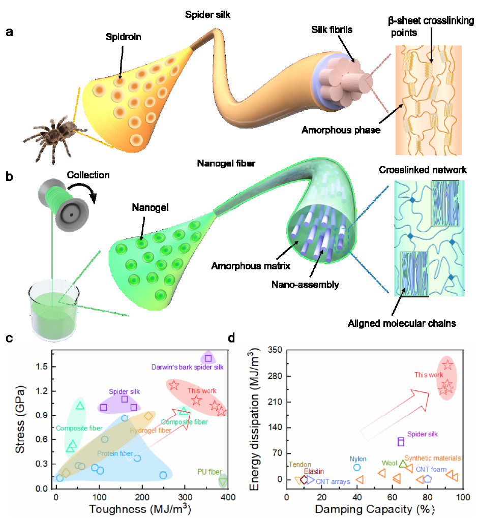 近日,南开大学刘遵峰、中国药科大学周湘与东华大学朱美芳研究团队受蜘蛛丝蛋白结构的启发,制备了一种可溶的交联纳米凝胶,并纺制了具有类似蜘蛛丝层次结构的交联纤维,为高强高韧纤维材料的直接纺丝提供了一种新策略。