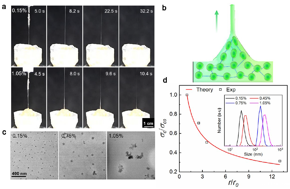 为研究纳米凝胶拉伸纺丝能力与粒径的关系,研究者将纤维在机械测试仪上进行纺丝,直至纤维断裂,同时测量机械应力。通过理论模型预测出,导致纳米凝胶断裂的临界应力与纳米颗粒半径的平方根成反比。