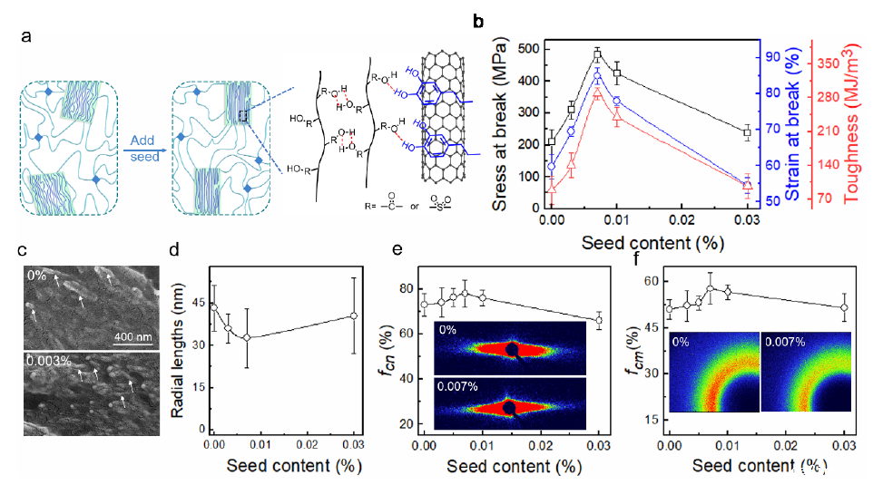 为进一步研究是否可以通过添加成核粒子来调节纳米组件的尺寸和排列,以提高纤维力学性能,研究者制备了单壁碳纳米管/聚多巴胺(SWNT-PDA)复合物,并在SWNT-PDA存在下合成了交联剂含量为0.15%的纳米凝胶,随后研究了成核粒子的引入对纳米凝胶纤维结构和性能的影响。结果表明,随着SWNT-PDA含量的增加,纳米凝胶纤维的断裂强度、断裂应变和韧性呈现上升趋势,纳米组件的排列更加整齐,平均直径减小。