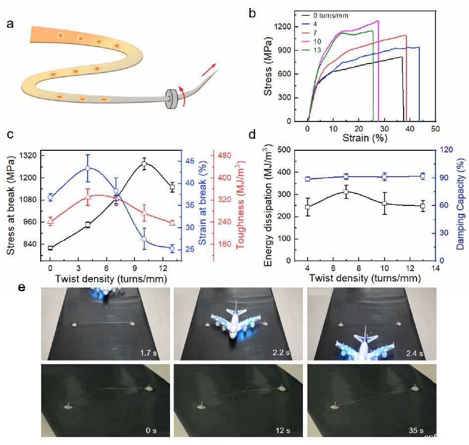 通过纤维的预拉伸,分子链的排列显著增加,纤维平均直径减小。对于预拉伸应变为50%的纤维,该结构演变显著提高了纤维的机械强度,并降低了其断裂伸长率。经过进一步的加捻优化,最终实现了纤维断裂强度1.27GPa和韧性383MJ /m3的组合,与天然蜘蛛丝的性能值非常接近。