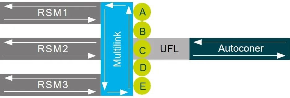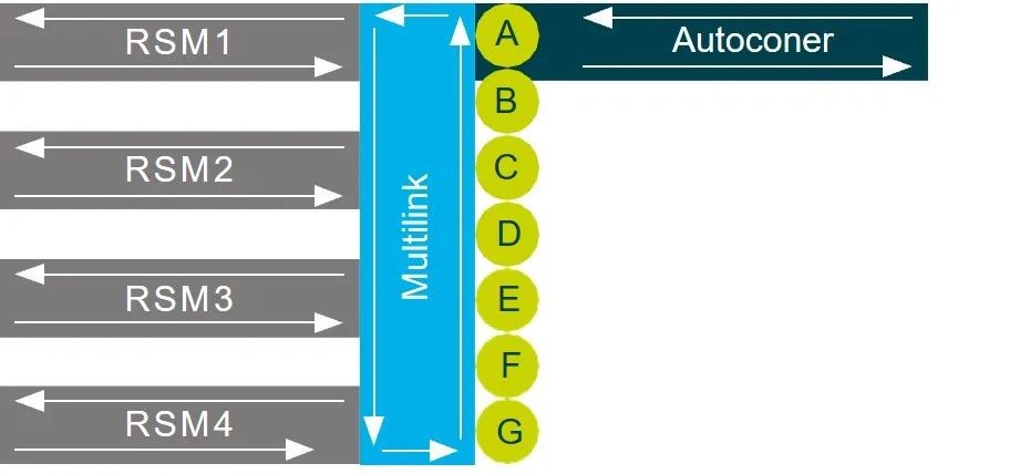通过Multilink最多可将4台细纱机联至一台Autoconer X6络筒机。之前无法实现经济性自动化的纱厂,这种方式可使之成为可能,例如用于空间狭小或受限的场地,以老车间设备改造为典型情况。如果客户的纺纱厂内空间非常局促,现在也能做出合适的布局。