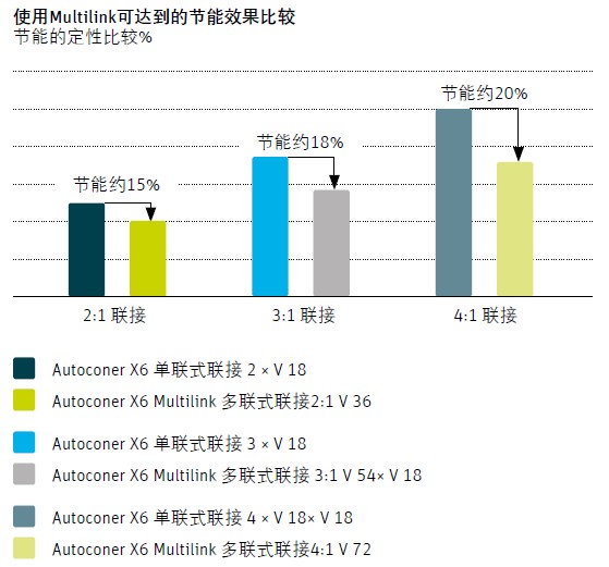 对于设计细络联多联式系统以及对应的产能计算来说,其联接界面及物流系统的最大管纱处理能力则是决定性因素。对此Autoconer X6全自动络筒机独特的优势是配有获得专利的光学式红外线验管器,使验管速率高达每分钟100个,这样就使联接界面的处理能力达到最大化(≥ 60/min)。因此,和其它络筒机相比,Autoconer X6全自动络筒机允许更多的细纱机台数与其联接。投资Multilink变得更有吸引力,因为对纺纱厂来说,可降低其运营成本:根据配置不同,能源成本(与单联式相比)可降低20%,运营成本(与RM型纱库式机器相比)可降低70%。运输自动化需要较少的一次性支出的设备,例如升降机,这使得自动化水平更高。