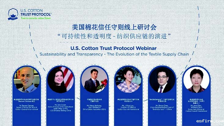 3 月17日,美国国际棉花协会(CCI)首次在中国举办U.S. Cotton Trust Protocol®(美国棉花信任守则)线上研讨会,向纺织供应链的企业和品牌及合作伙伴详细讲解美国棉花信任守则和信任守则消费管理解决方案。