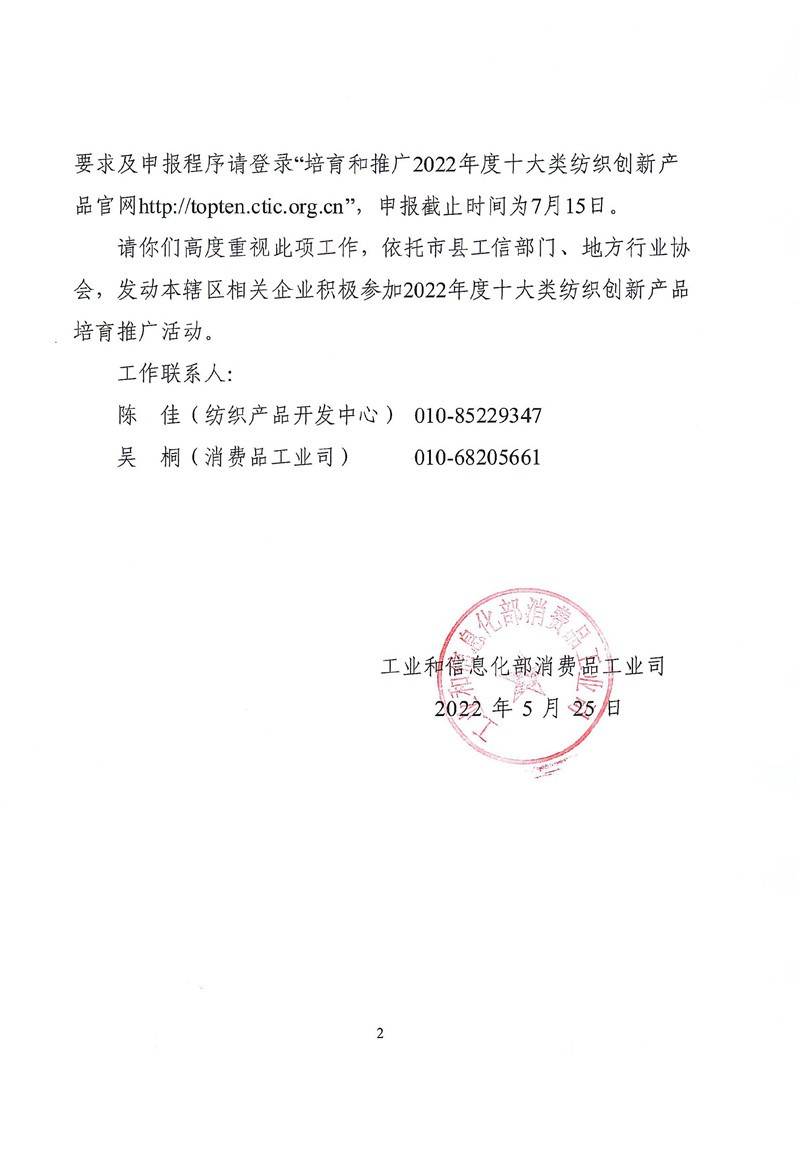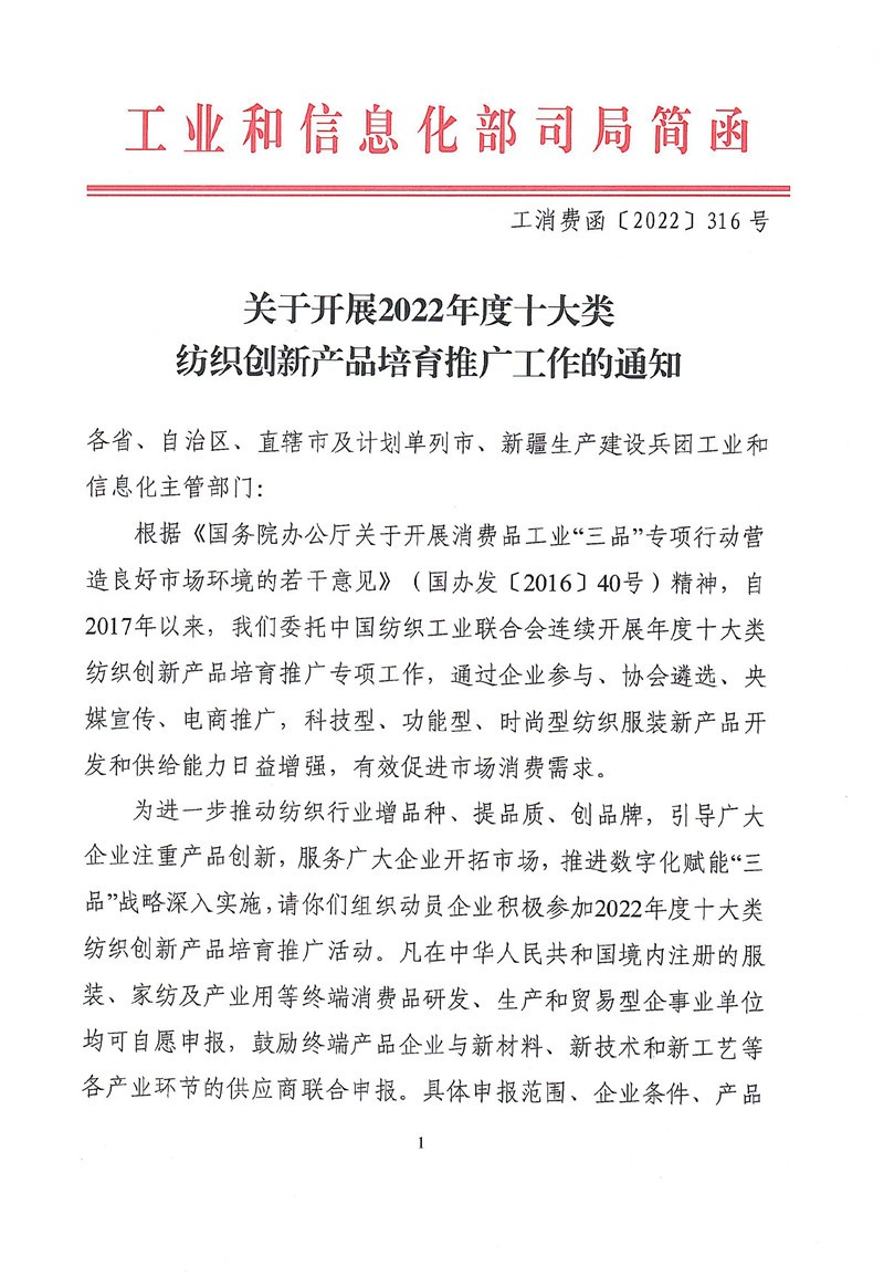 文件下载:中国纺联函〔2022〕40 号-- 关于开展培育和推广2022年度十大类纺织创新产品工作的通知