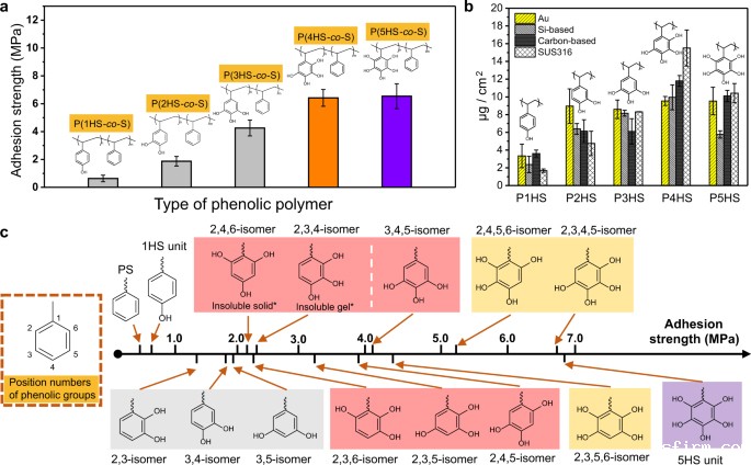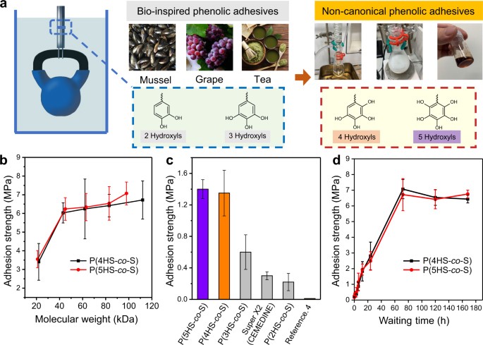 研究人员合成了2,3,4,5-四甲氧基苯乙烯(TMS)和2,3,4,5,6-五甲氧基苯乙烯(PMS)用于后续聚合。这些单体与苯乙烯(S)的自由基聚合,然后对甲氧基进行去保护,得到非典型酚类共聚物P4HS和P5HS(数字代表羟基数量),随着聚合物分子量的增加,P(4HS-co-S)和P(5HS-co-S)的粘附强度由3.4MPa增加到6.0MPa。尽管两种非典型酚醛聚合物的粘合强度相似,但P(5HS-co-S)的粘合强度分布比P(4HS-co-S)窄,仅在10秒后达到1.4MPa。