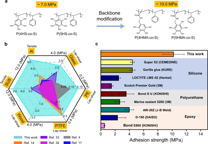 虽然传统粘合剂如氰基丙烯酸酯、环氧树脂和聚氨酯在干燥环境中使用效果很好,但在水下的性能不佳。近期,日本东京大学研究人员设计了一种粘合强度超过10MPa的超强水下粘合剂,粘合强度接近商业干粘合剂。通过系统地研究羟基的数量和位置,阐明了粘合剂粘合性能的内在机理。该研究以“Ultrastrong underwater adhesion on diverse substrates using non-canonical phenolic groups”为题发表在国际顶级期刊《Nature Communications》上。