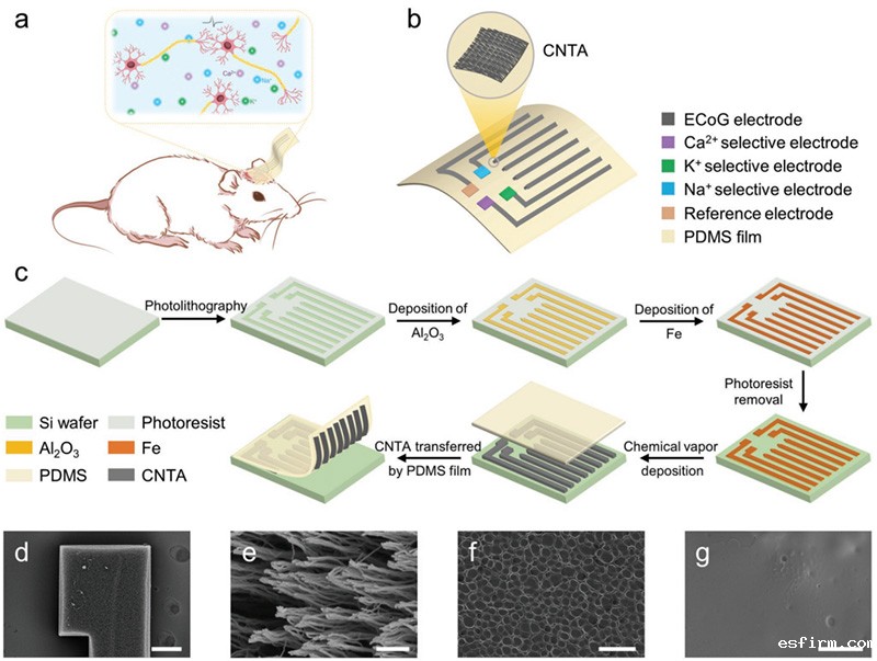 为解决这一问题,近期复旦大学彭慧胜教授、孙雪梅教授团队开发出了一种实时记录大脑皮层活动的高效传感器。该团队利用聚二甲基硅氧烷作为传感器的柔性基底,碳纳米管阵列作为传感器的电极材料,实现了对大脑皮层钙离子、钠离子和钾离子的实时监测。在14天的使用过程中,电极性能的变化不大,重复动态折叠1000次后,电极材料仍然可以用于大脑皮层活动的实时监测。
