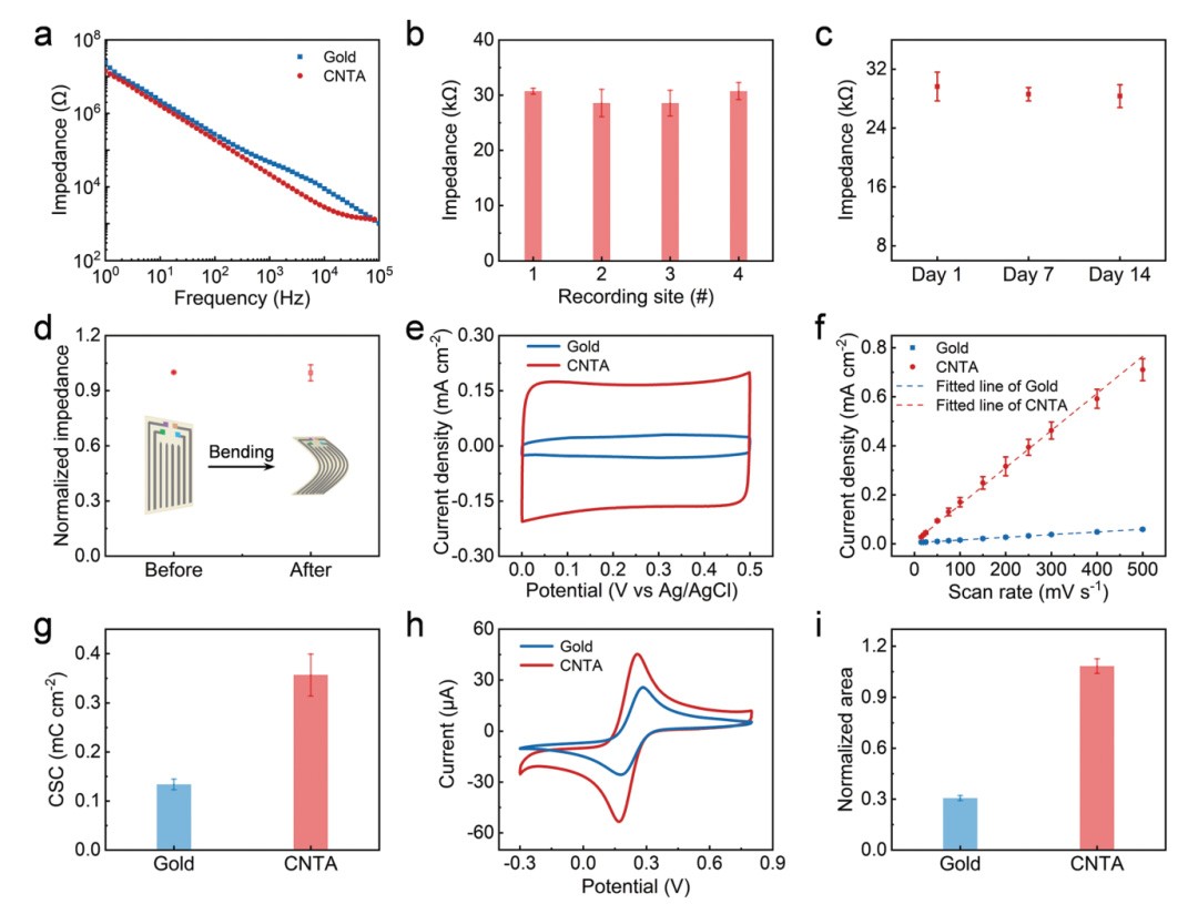 相比利用金基材制备的现有传感器,碳纳米管阵列传感器电极材料有相对大的比表面积,因此具备更大的电荷容量,并且碳纳米管阵列传感器电极的内阻也远小于金基材的传感器电极,使得碳纳米管阵列传感器电极更高的检测精度。在进行多天监测实验和多次弯折实验,该传感器电极的性能保持基本不变,证明了传感器电极材料的耐久性。