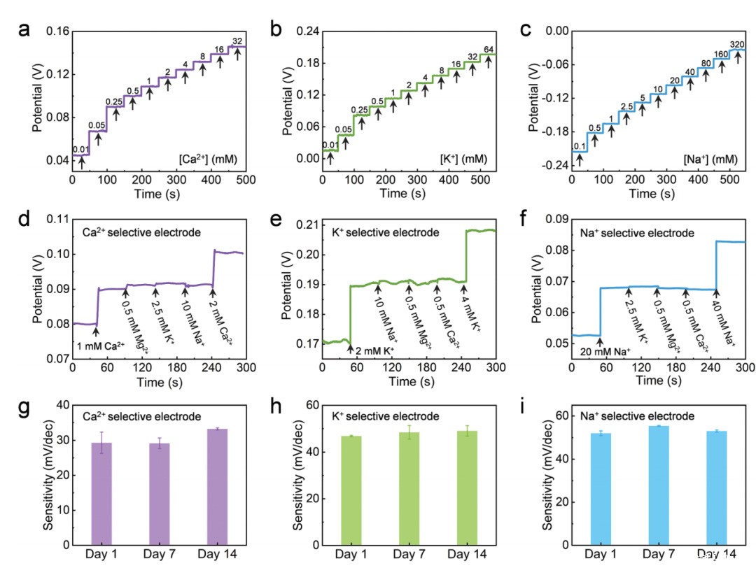 当改变被测离子如钙离子、钠离子或者钾离子的离子浓度时,传感器的电压发生了明显的变化。而当在被测试液体中引入其他干扰离子如镁离子,传感器的电压则没有发生明显变化。这就证明了传感器具备良好的抗干扰性能。