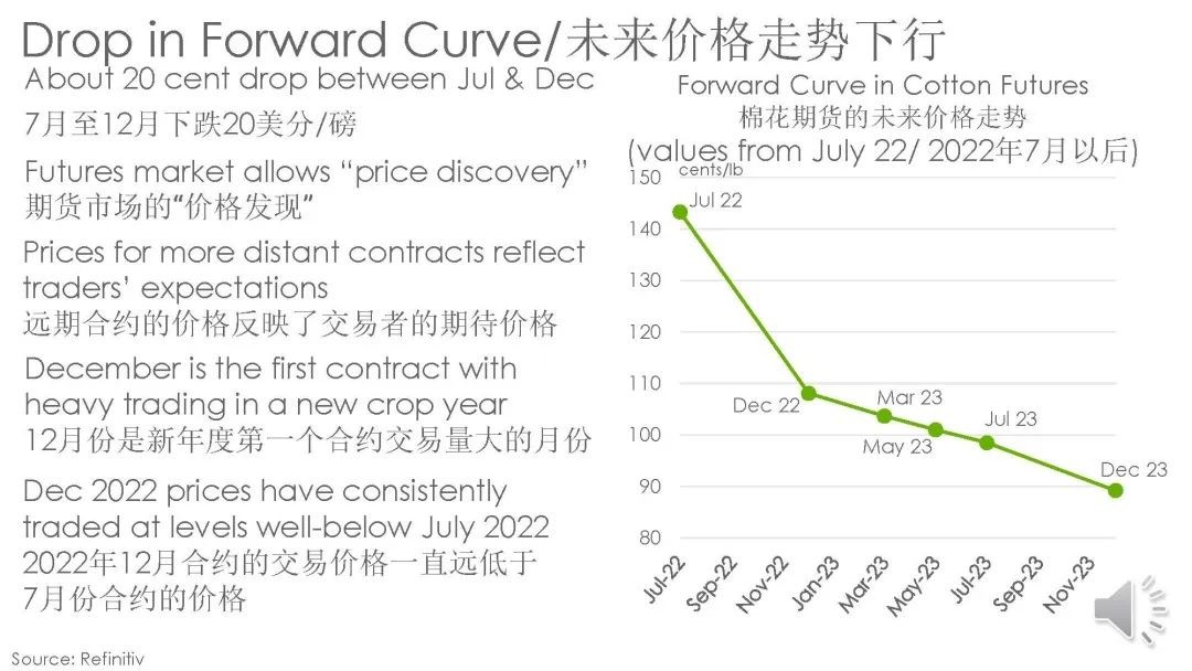 今年以来,全球棉花市场波动频繁,近一个月棉花价格也曾出现大幅下跌。当前国际棉价跌势虽有所放缓,但仍处于振荡不稳定期。对于这一现象,林蓓指出,最近的价格波动不仅限于棉花市场,是大宗商品板块整体下降所致,这表明投资者对整个市场的信心发生了巨大变化。“通货膨胀的影响、经济刺激措施的退出、利率上升以及对可能出现的衰退的担忧,都可能是投机性押注逆转的原因,也都可能是造成价格下跌的原因。”