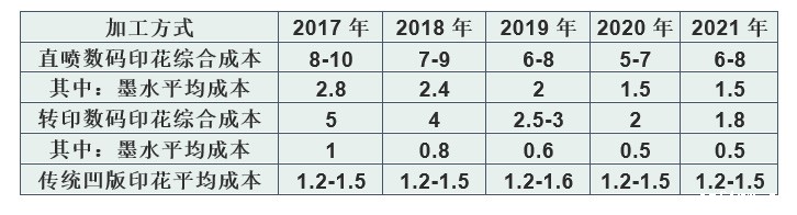 2017—2021年我国数码喷印与传统印花成本变化(单位:元/米)