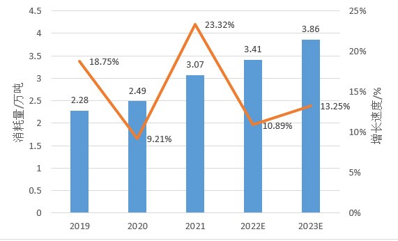 2019年,我国纺织数码喷墨印花墨水消耗量在2.28万吨,2020年受疫情影响,增长速度有所放缓,为2.49万吨。2021年,由于我国疫情控制稳定,进出口贸易放开,经济回暖,纺织数码喷墨印花墨水消耗量约为3.07万吨。预计到2023年,我国纺织数码喷墨印花墨水消耗量将达到3.86万吨左右,到2025年达到4.9万吨左右。