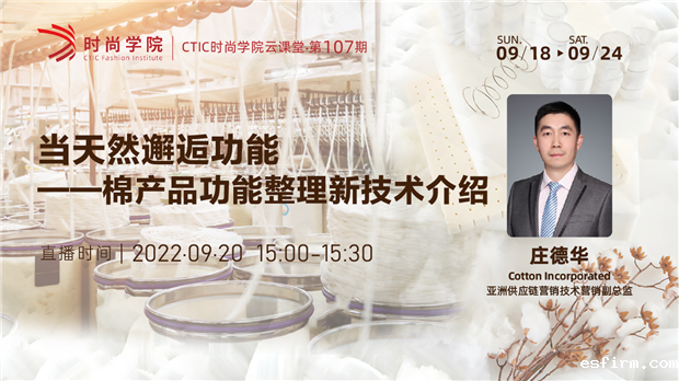9月20日,Cotton Incorporated亚洲供应链营销技术营销副总监庄德华先生做客“CTIC时尚学院”直播平台,携手中国女装面料流行趋势研究院共同带来了《当天然邂逅功能-棉产品功能整理新技术介绍》。通过对TransDRYTM、WICKING WINDOWSTM、SWEAT-HIDING、STORM COTTONTM和TOUGH COTTONTM等棉产品的新型功能整理技术原理和性能优势的解读,庄德华分享了在棉上实现吸湿快干、超级防水及持久耐磨等功能的解决方案。