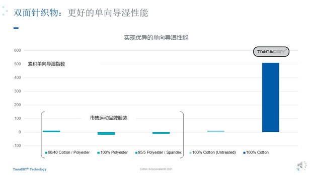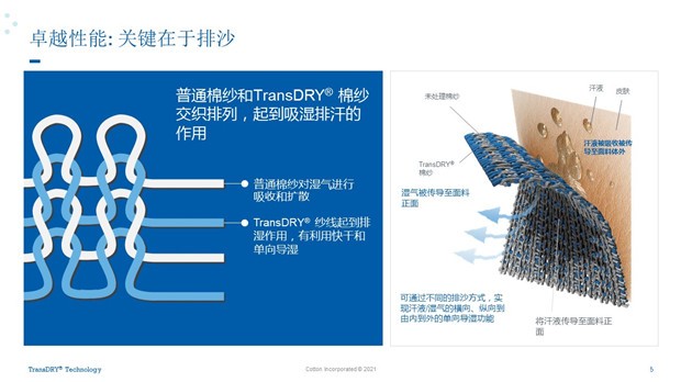 庄德华首先分享了三种在棉质面料上实现湿气管理性能的整理技术。其中,TransDRYTM技术通过将特殊拒水加工后的棉纱与普通纱线交织排列,起到了吸湿、排汗和快干的作用。“该项技术的关键在于纱线处理,可通过不同排纱方式,实现汗液/湿气从横向、纵向到由内到外的单向导湿功能,不同的织物结构会有不同的性能表现。”