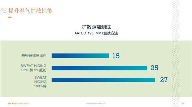 棉的另一项吸湿排汗技术WICKING WINDOWSTM则是在面料反面部分区域以印花方式印上防水剂,通过控制印花浆料的渗透,保证防水剂不接触到面料正面,当水分或湿气通过没有防水剂处理的区域后,即从面料反面传导到面料正面,并在空气中蒸发,从而实现单向导湿。在不同组织结构的面料上,WICKING WINDOWSTM都可以实现迅速的吸水。