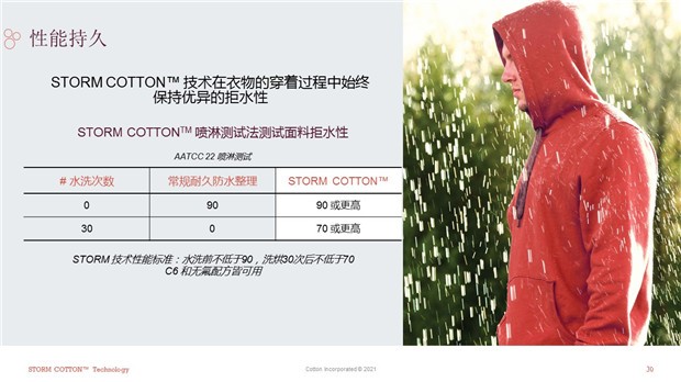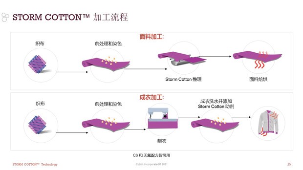 STORM COTTONTM技术是一项用于棉制面料或服装的超久耐久拒水整理技术,可赋予穿着者良好的抗雨雪性能并保持棉天然的舒适性。这项技术不影响棉的透气性和柔软度,可应用于面料或成衣,不限于针织、机织和牛仔产品。