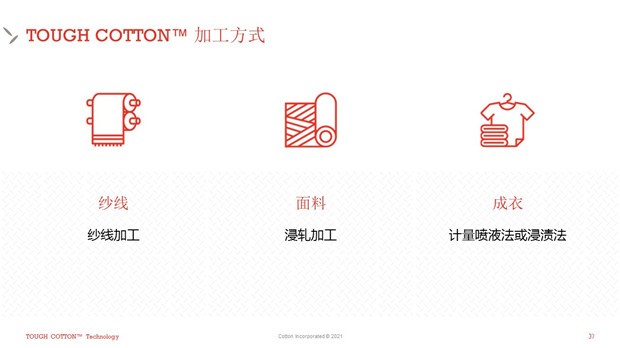 用于提高棉质服装穿着耐久性的技术TOUGH COTTONTM,同样拥有广泛的应用场景,可用于纱线加工、面料加工,也可用于成衣加工,以满足不同终端产品的需求。经过TOUGH COTTONTM处理后的面料或成衣,具有持久的耐磨性和良好的手感和悬垂性,可用于针织及梭织面料和服装。