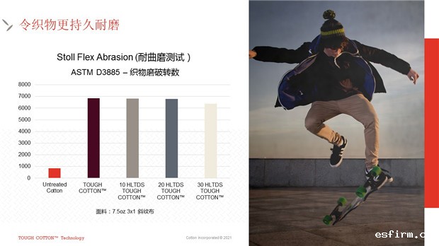 庄德华指出,该项技术采用的聚乙烯软油能够提高面料的耐磨性及撕破强力,交联剂(PBI)则提高了面料的功能耐久性。“对于TOUGH COTTONTM,我们有严格的性能指标,需要处理后的面料经过20次洗烘之后,耐磨程度较处理前的面料提高2倍以上才为合格。”