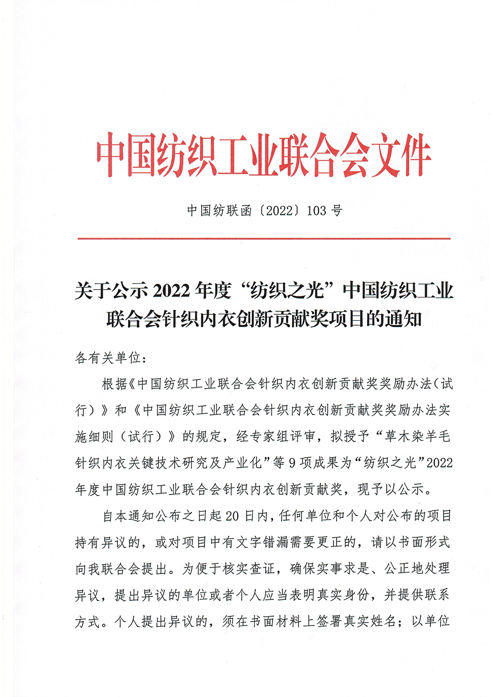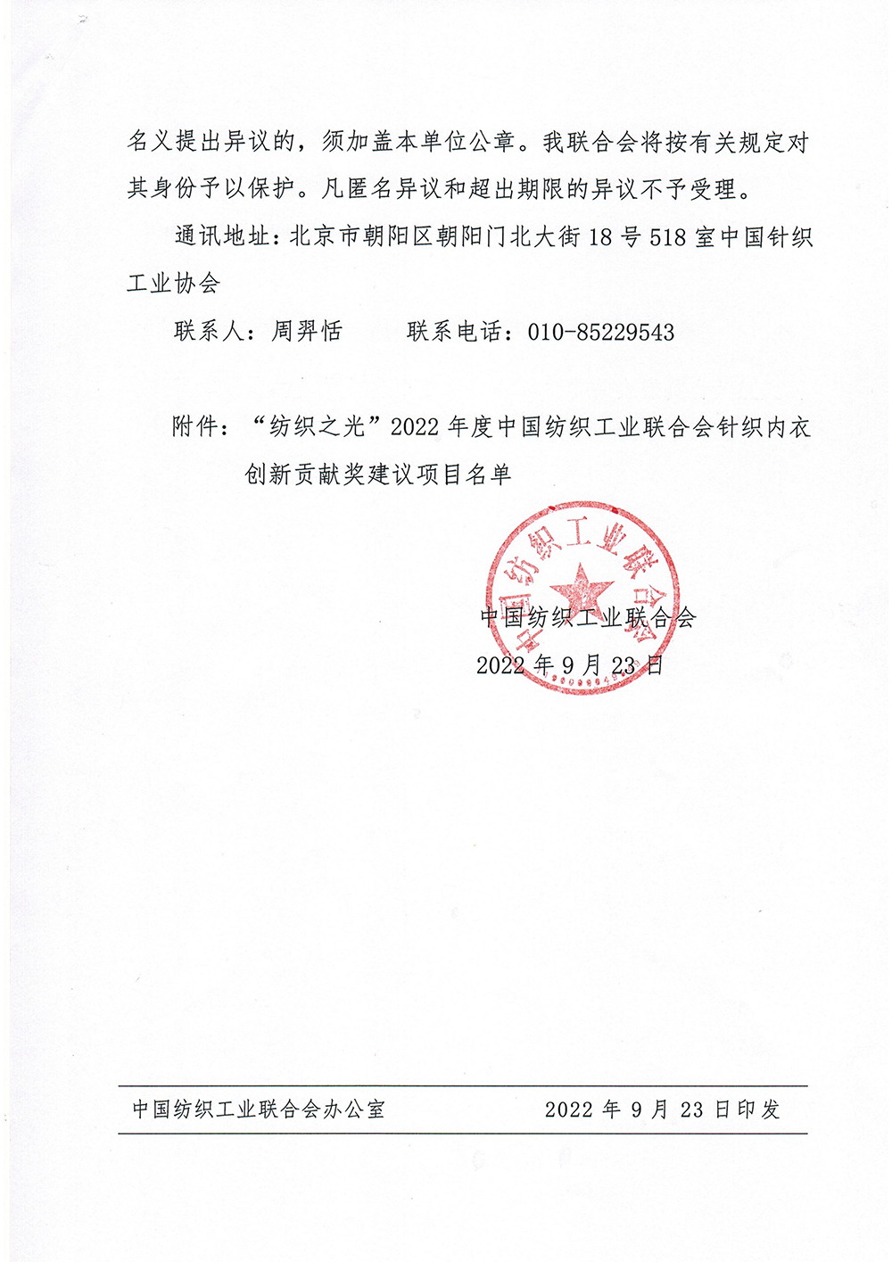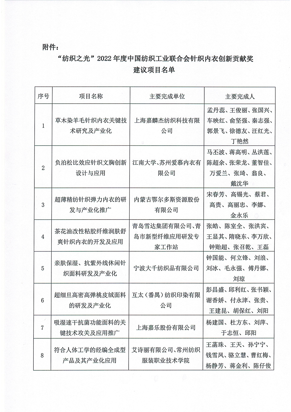 关于公示2022年度“纺织之光”伟德app官方正版下载地址针织内衣创新贡献奖项目的通知