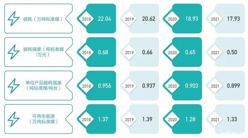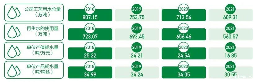 应用先进技术,公司低碳环保指标显著提升,单位产品能耗强度从2018年每吨纤维0.956吨标准煤,逐步下降到2021年每吨纤维0.899吨标准煤,单位产值耗水量从2018年25.22吨/万元,逐步下降到2021年16.85吨/万元。