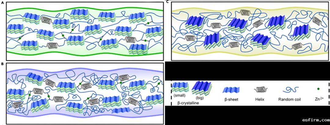 经过上述处理过程后,将RSF-SN和RSF-Pa浸入溴化锂溶液中进行复性后,发现丝线可以高效组装成水化动力半径为20~30和200~300nm的大型复合物,并通过圆二色谱及刚果红染色实验协同证实这些蛋白之间形成了成β-堆积结构。但该特性也使得它们在纯水中易于形成凝胶,因此研究者将所得丝线冻干后分散于六氟异丙二醇(HFIP)中,以便用于人工纺丝。