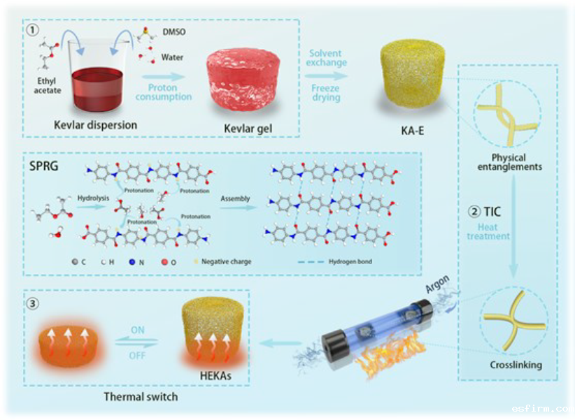 近日,东南大学和中科院苏州纳米所研究采用慢质子释放-调制凝胶化和热诱导交联策略,设计并制备了一种超弹芳纶纳米纤维气凝胶(HEKAs)。