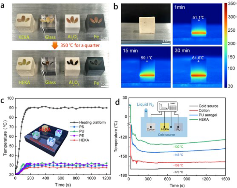研究人员将HEKA、玻璃、Al2O3陶瓷和同等高度的铁块放在加热台上,并在350℃下将新鲜的花瓣放在每个材料上面。在加热15分钟后,HEKAs上的花瓣只出现了轻微的脱水和萎蔫,而放在其他材料上的花瓣则出现了烧焦和炭化,表明HEKAs在高温下具有良好的隔热性能。