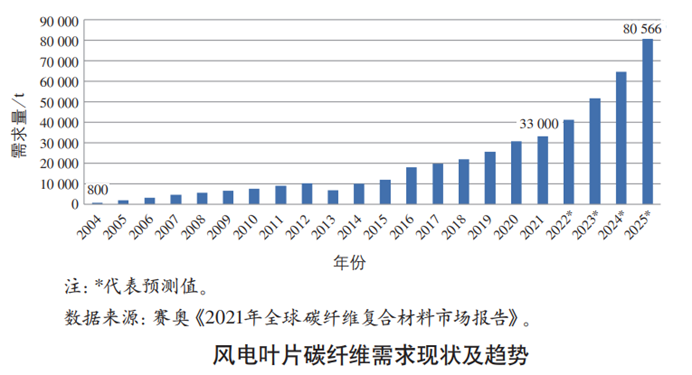 “30·60”双碳背景下,作为可再生能源重要组成部分的风能将维持高速增长,市场对风电叶片的技术发展要求越来越高,叶片向大型化、轻量化方向发展,轻质高强的碳纤维是超大型叶片增强材料的必然选择。