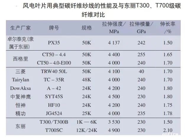 国内外风电叶片用碳纤维性能基本处于东丽公司T300级、T700级碳纤维水平。总体上来看,国产碳纤维在性能、质量、生产效率提升和成本降低方面还有巨大的进步空间。