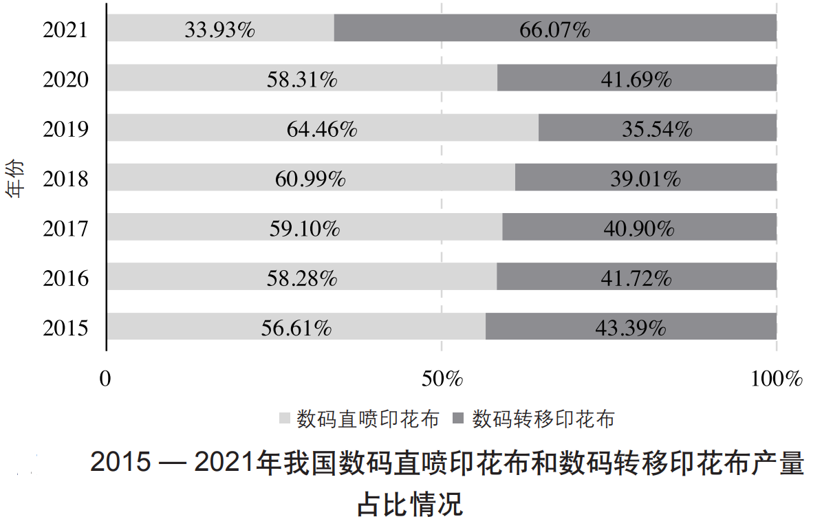 另外值得注意的是,受“快时尚”市场风向等因素影响,工艺流程更短、加工难度更小的转移印花技术近年来受到市场越来越多的关注。2015 — 2021年,我国数码直喷印花布产量在印花布总量中的占比整体呈先上升后下降的趋势,2021年数码转移印花布的产量首次超过数码直喷印花布。