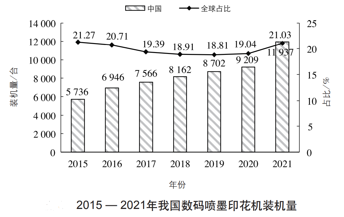 随着数码喷墨印花设备和工艺的逐渐发展成熟以及综合印花成本的下降,数码喷墨印花越来越被下游用户认可和接受,尤其受近几年疫情以及复杂多变的经济形势影响,数码喷墨印花机生产方式更加灵活,更能适应小批量快速反应类订单的生产。2015 — 2021年,我国数码喷墨印花机装机量呈逐年上升趋势,2021年装机量达11937台,同比上一年增长29.62%,占全球总装机量的21.03%。这是由于国产设备在性价比和快速的客户响应方面占有很大的优势,同时随着东南亚等国纺织产业的崛起,我国数码喷墨印花机出口量也呈逐年增加的趋势。