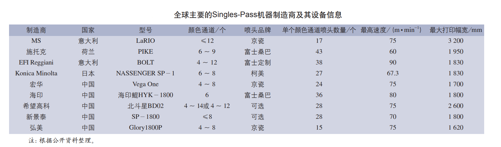 虽然目前数码喷墨印花机仍以扫描式数码直喷机为主,但是为了追求数码喷墨印花与圆网印花相当的印花速度,全球主要的数码喷墨印花机制造企业争先研发可与圆网印花机印花速度匹敌的Single-Pass超高速数码喷墨印花机,这也在一定程度上反映了企业在数码喷墨印花机领域的研发和制造实力。但当前Singles-Pass机型存在价格高、对花型有要求、喷头数量多且运行稳定性略差、机器运行维护难度大等问题,因此虽然很多企业相继推出该机型,但在市场中仍未得到广泛的推广应用。