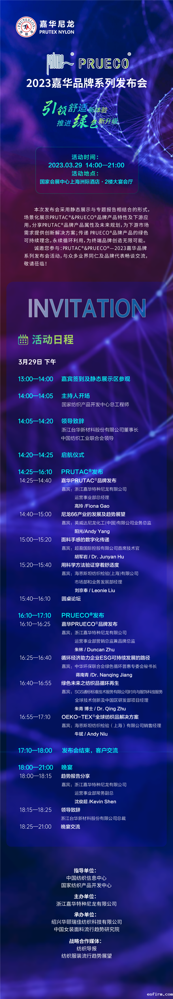 本次发布会将围绕“引领舒适新体验 推进绿色新升级”主题,发布浙江嘉华特种尼龙有限公司旗下PRUTAC®、PRUECO®品牌产品,通过专题报告与静态展示相结合的形式邀请业界专家解读锦纶66与再生锦纶的特色优势、创新方案和未来趋势,同时场景化展示PRUTAC®、PRUECO®品牌的产品特性及下游应用。