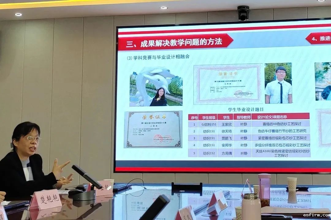 叶静重点介绍了项目成果主要解决的教学问题和方法、项目成果特色与创新点。她分享到,成果主要从构建微观校企协同育人教学模式;构建基于产业需求的课程教学体系;融入思政元素,扩展和优化教学内容,创立多渠道、多元化立体学习空间;推进教学手段和方法改革等方面解决教学问题和方法。项目的成果特色和创新点在于,基于利益视角建立校企双方共赢的共同目标,实现校企合作长效化发展;构建了以产业需求为导向的三位一体的课程体系;构建了多方位的《新型纺纱技术》课程微观校企协同育人教学模式;创立了基于“现代纺织”理念下的“五关联”教学方法;建立了创新指向的学科竞赛与毕业设计相融合的实践教学模式。