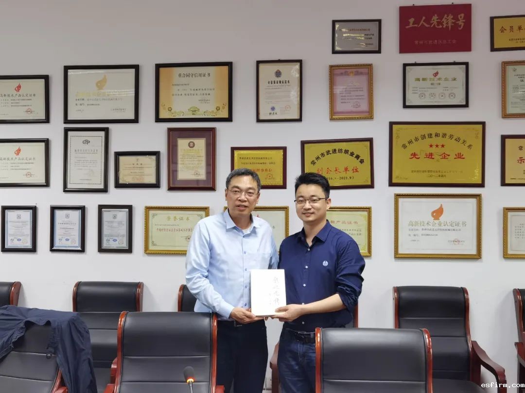 座谈会上,叶志民理事长代表纺织之光科技教育基金会向五洋纺机副总经理王水赠送《钱之光传》。