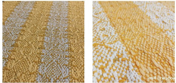2、经纱选择竹节纱,纬纱以橘黄色和白色银丝结子线间隔排列的方式打纬,采用左右经向斜纹对称的组织,所得面料图案规整,不同花式纱线的交织使面料表面有一定的凹凸感,带子纱使织物更加柔软,结子线使面料上有银丝光泽的结子零散分布,波纹竹节纱增添面料的美观性,色彩搭配温暖和煦,外观别致,适用于制作桌旗、沙发布、桌椅垫、抱枕套、茶巾、夏季地毯织物等,外观整洁,结实耐用,能够给空间增添明亮感与舒适度。