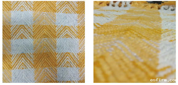 1、以波纹竹节纱和银丝结子线为原料,选择较粗的纱线及特殊的经纱排列方式可使得面料呈现较大的花纹图样,黄色与白色搭配使用,面料成品的手感更柔软,有弹性,美观素雅,配色协调,保形性与悬垂性较好,立体感强,适于制作沙发布、座椅套及桌旗等家居装饰织物。采用毛纤维纱线制造的织物给人带来亲切温暖感,应用于沙发布这类覆盖面积较大的场景时可使空间更加协调,带来触觉与视觉上的双重享受。