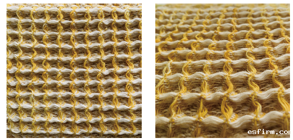 3、以竹节纱和圈圈纱为原料,用蜂巢组织织成的中厚型面料,立体感强,圈圈纱和竹节纱的使用增添了织物的毛型感、凹凸感以及柔软度。成品美观、手感柔软、保暖性好,有类似华夫格的外观,可用作地毯、茶巾、垫子、艺术类装饰挂画等,且面料毛型感极强,可增添环境的温暖舒适氛围,作地毯柔软有弹性,作挂画富有装饰性。