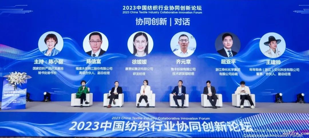 协同创新对话环节由国家纺织产品开发基地秘书处秘书长陈小丽主持,福建永荣锦江股份有限公司(国家功能性聚酰胺纤维产品开发基地)高级合伙人/副总经理陈信富、康赛妮集团有限公司(国家羊绒和花式纱线产品开发基地)研发经理徐媛媛、鲁丰织染有限公司(国家印染免烫面料产品开发基地)技术研发部经理齐元章、浙江传化化学集团有限公司(传化智联股份有限公司|国家纺织化学品开发基地)总裁屈亚平、年年有余(浙江)文化科技有限公司(国家新汉服产品研发基地)董事/合伙人/副总经理王建帅,共同就产业链、供应链上下游的协同创新展开了热烈探讨。