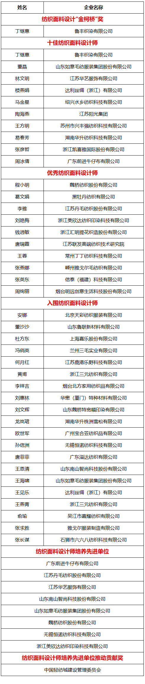 第八届(2023年)全国十佳纺织面料设计师及培养先进单位获奖名单