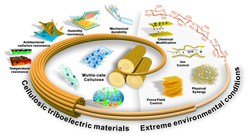 近日,聂双喜教授课题组在最新一期《Materials Today》上发表了题为“Harvesting energy from extreme environmental conditions with cellulosic triboelectric materials”的综述文章。从宏观纤维束到微观纤维素大分子链的角度探讨了纤维素摩擦电材料调控策略,包括表面化学功能化修饰、离子调控、物理协同作用以及力场调控。展示了纤维素摩擦电材料在宽温度、高湿度、高腐蚀、高辐射等极端环境条件下的能量收集和新兴应用,以及未来的无限发展潜力和面临挑战。