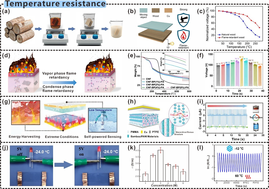 大多数摩擦电材料在极端温度(-196℃,200 ℃)环境条件下运行时,往往会面临高温环境发生降解、低温环境发生脆性断裂现象,这严重限制了其在极地探险、航空航天等极端温度环境条件下的应用推广。开发具有耐宽温度的纤维素摩擦电材料,为在极端温度环境条件下应用的优越可行性和成本效益开辟了新的前景。