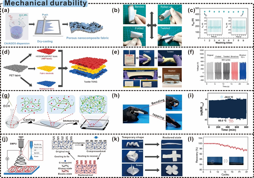 TENGs通过将摩擦振动、旋转运动、振荡运动、胀缩运动等多种机械运动转化为电能,但摩擦电材料在机械接触和摩擦过程中会产生严重磨损,特别是在反复的强机械脉冲作用下,会导致工作寿命的显著降低。随着自供电器件在可穿戴柔性领域的广泛应用,对摩擦电材料的机械耐久性和柔韧性提出了更加严格的要求。