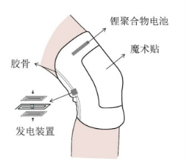 传统的护膝通过化学物质或电池加热护膝达到保暖效果,但是存在化学物质易泄漏、环境污染、寿命短等缺点。因此许多设计者开始将智能传感、自发热等技术应用于多功能护膝产品的开发。如在护膝产品中,采用电磁式能量收集器,将运动时产生的机械能转化为电能储存在储能器件中,最后通过碳纤维发热元件将电能转化为热能,达到发热缓解膝关节疼痛的目的。